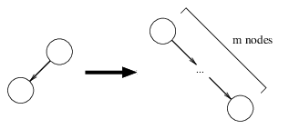 Given some constant p and a double right-branching chain T of m left nodes and n right nodes where m>0 and n>0, we perform the following transformation:
